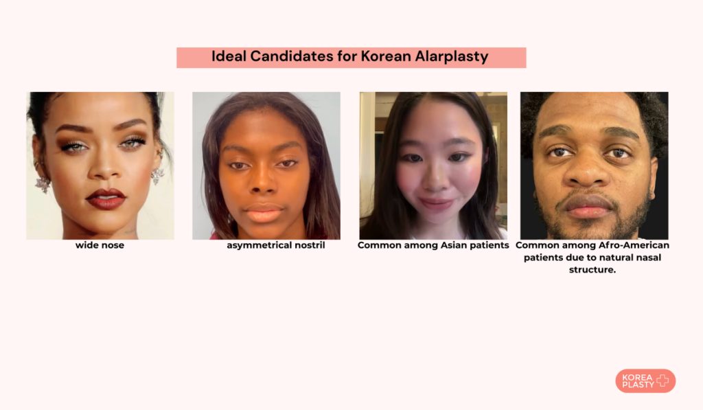 A good candidate for alarplasty in Korea is anyone with wide nasal wings, a thick alar lobule, or large, flared, asymmetrical nostrils. Ideal candidates feel their nostrils are too wide, too flared, or asymmetrical and want a more balanced look. Alarplasty is suitable for patients with a bulky nose shape or a wide alar base, and it is common among Asian and Afro-American patients. The alar wedge resection technique is suited for someone who has a wide alar flare.