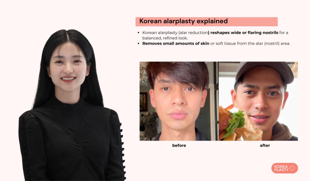 Korean alarplasty, called alar reduction (resection), is a cosmetic surgical procedure that refines and reshapes the appearance of the nostrils by removing a small amount of skin or soft tissue from the alar region. Performed as a less invasive outpatient procedure under general anaesthesia, it narrows wide or flaring nostrils and improves facial symmetry and, in some cases, breathing issues.