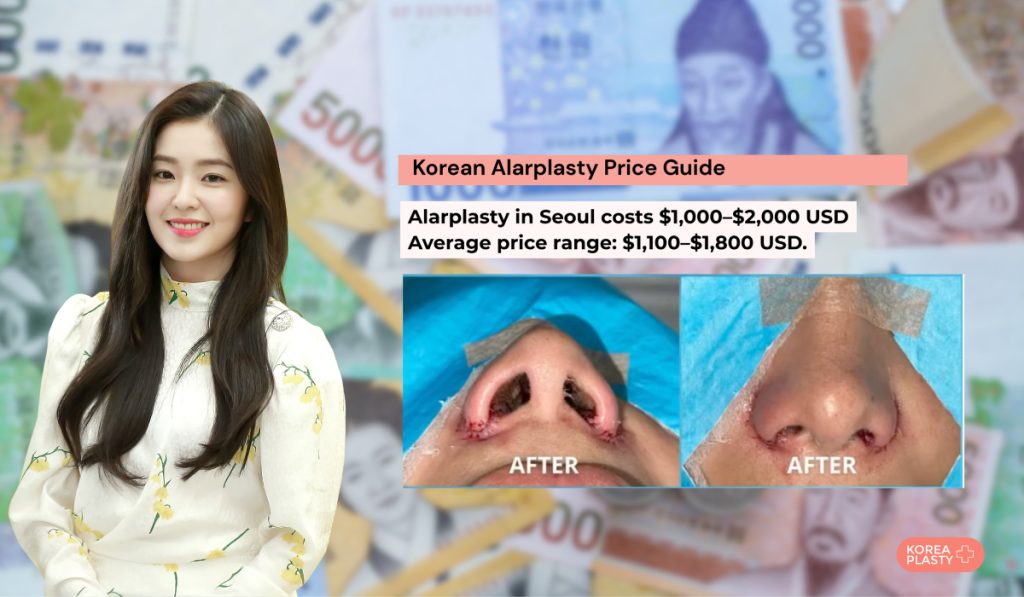 Alarplasty in Seoul typically costs between $1,000 and $2,000 (1,300,000-2,600,000 KRW), with most clinics quoting an average of $1,100-$1,800. General price guidelines start from USD 1,000, and the procedure is cost-effective compared with the United States, where the same surgery averages $7,000-$10,000. Final fees vary depending on the clinic, the surgeon’s experience, and whether alarplasty is combined with other nose procedures. Some clinics offer a discount when alar reduction is added to traditional rhinoplasty.