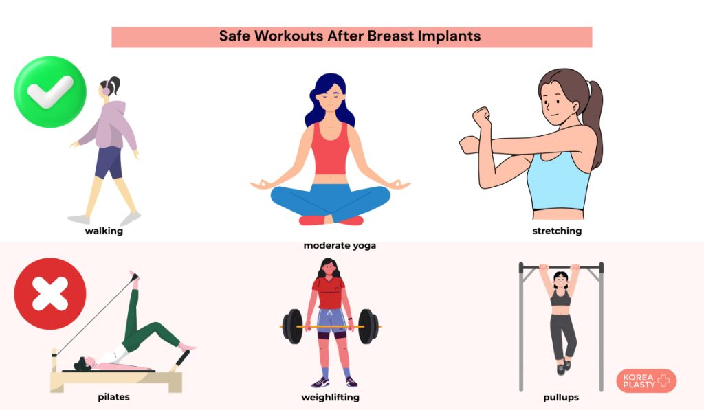 - You should avoid advanced pilates and yoga poses, chest press, overhead presses, bench press, and using arm devices on elliptical trainers after breast augmentation;