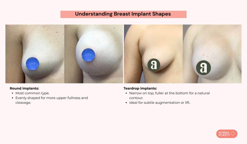 Breast implants are available in two shapes: round and teardrop. Round implants are the most commonly used shape. They have a symmetrical, consistent shape all over and promote more upper breast fullness and cleavage. Saline implants only come in round implant shapes.