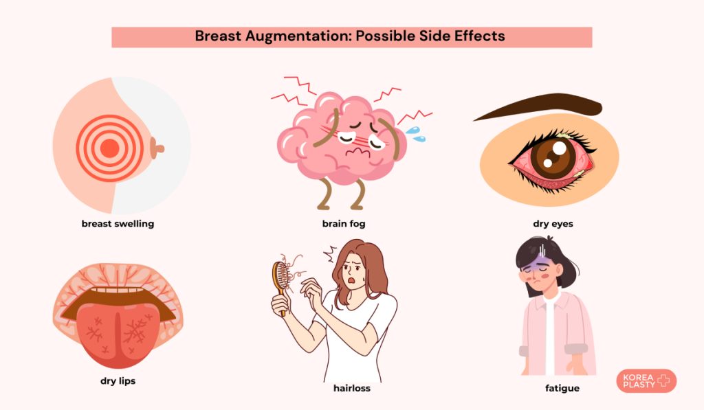 - Breast augmentation complications may include breast pain, changes in sensation, scar tissue, rupture, deflation associated with breast implants;