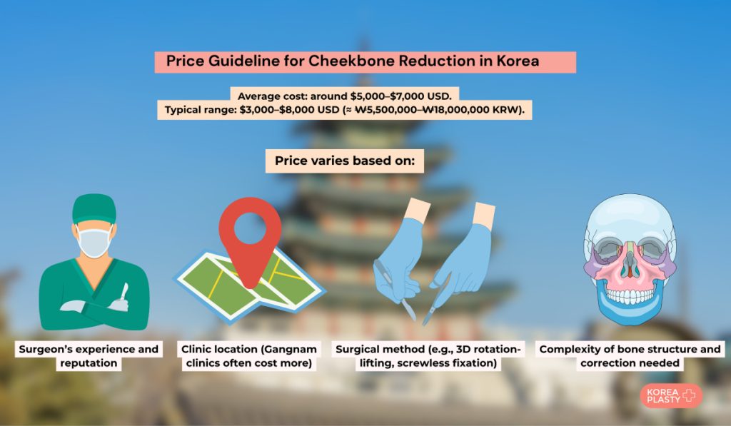 In Korea the cost of cheekbone reduction surgery generally ranges from $3,000 to $8,000 USD. The average figure is $5,000-7,000. Costs range from approximately $3,784 to $6,054 depending on various factors including the surgeon’s expertise and clinic location. The lower price is 5,500,000 ₩ while the high price is 18,000,000 ₩. Procedure price depends on chosen method of correction, status of doctor, clinic, complexity of the procedure, and facility where the surgery is performed.