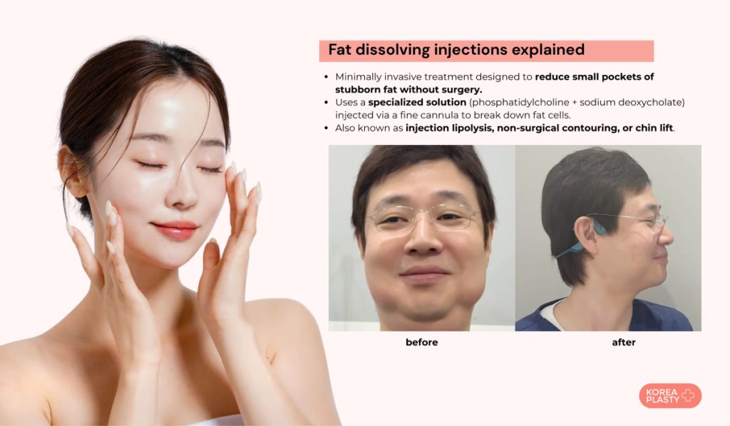 Fat dissolving injections in Korea are minimally invasive treatments designed to reduce small pockets of excess fat without surgery. A slender cannula is used to introduce a specialized fluid into the fatty tissue. This fluid contains phosphatidylcholine and sodium deoxycholate as primary constituents and aids in the emulsification and breakdown of adipocytes. The procedure is known as injection lipolysis, non-surgical chin lift, or contouring, and it is performed with a topical anesthetic and ice pack to numb the area, resulting in little to no downtime.