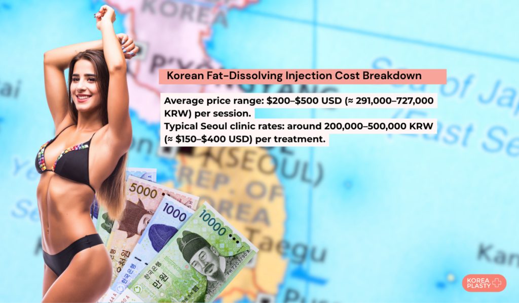 The cost of fat dissolving injections in Korea generally ranges from $200 to $500 USD. This translates to approximately 291,000 KRW to 727,000 KRW. Typical per-session ranges in Seoul are roughly 200,000- 500,000 (about USD $150-$400).