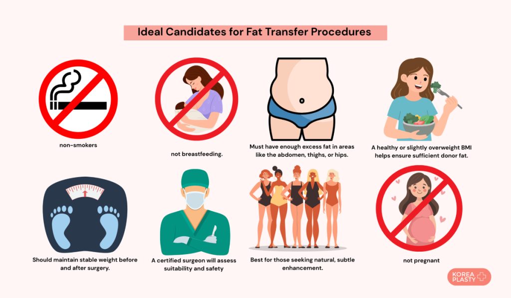 Prospective patients need to meet a few criteria to be deemed a good candidate for fat grafting. First, candidates for fat grafting must be physically healthy with no underlying medical conditions that increase surgical risk, impact healing, or limit pleasing aesthetic outcomes. Ideal candidates for fat grafting are non-smokers or are willing to quit smoking before and after the procedure, because smoking affects healing. Candidates for fat grafting must not be pregnant or breastfeeding.