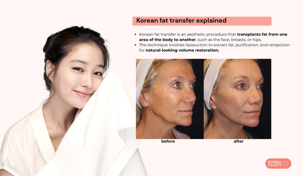 Korean fat transfer refers to an aesthetic procedure where fat is transplanted to other areas devoid of fat, including the face, breast, or hip. Autologous fat transplantation allows you to fill depressed areas and hide protruding cheekbones.