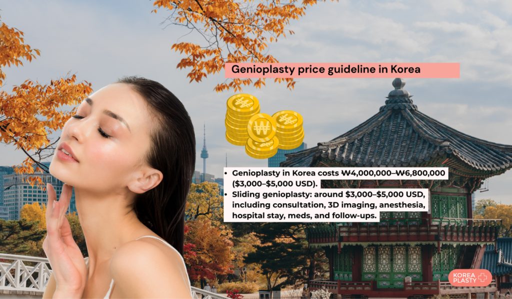 The cost of genioplasty in Korea ranges from 4,000,000 KRW (3,000 $) to 6,800,000 KRW (5,000 $). Sliding genioplasty typically ranges 3,000 USD to 5,000 USD as a standalone procedure, and this fee already includes pre-op consultation, 3D imaging, general anesthesia, surgery, one night of hospital stay, medications, and follow-up visits. The mid-range estimate for the total cost of chin surgery in Korea ranges from 6,330 USD to 12,510 USD when additional procedures, surgeon’s experience, clinic reputation, facility fees, and general anesthesia are accounted for.