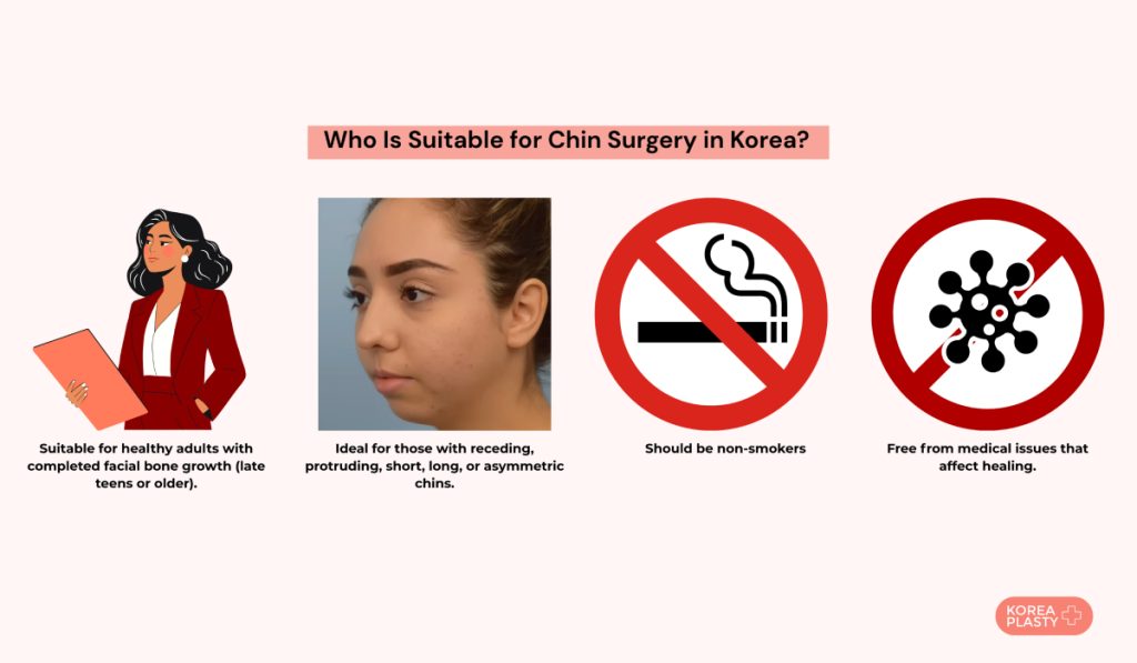 A good candidate for genioplasty in Korea is a physically healthy adult whose facial bone growth is complete, typically in the late teens or older. The person presents a chin that is disproportionate to the rest of the facial features, whether it is receding, protruding, short and dull, long, or asymmetric. Microgenia, macrogenia, facial asymmetry, and obstructive sleep apnea are clear indications for the procedure.