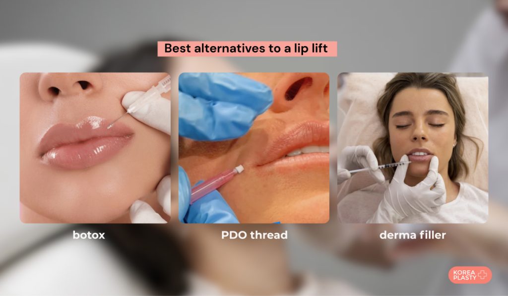 A lip lift alternative is any technique that shortens the apparent distance between the nose and the upper lip without formal surgical excision. Dermal fillers injected along the lip border create a nonsurgical lip lift; the outcome is never as profound as a surgical lip lift, yet they add volume, smooth lip lines, and require minimal downtime. A Botox lip flip is another subtle alternative: the provider injects BOTOX above the lip so that the orbicularis oris muscle relaxes and the upper lip gently rolls outward, giving a fuller appearance without modifying volume. PDO threads allow a minimally invasive PDO lip lift that substitutes for more involved surgical lip lift operations, while CO laser resurfacing shrinks skin and shortens the length of the philtrum, rejuvenating texture with five-to-seven-day downtime. Corner lip lift with Botox, Dysport, or Daxxify is performed without surgery; it targets muscles to uplift the corners of the mouth, transforms a frown into a more cheerful expression, and requires no anesthesia or extended recovery. These nonsurgical techniques enhance lip volume and contour without visible scarring, yet results vary in longevity and are less permanent than a surgical lip lift.