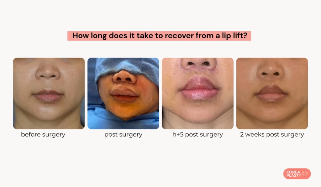 Patients sleep with the head raised, apply a warm compress at 30 minutes on, then 30 minutes off, and attend follow up appointments after two weeks to check scar healing. A lip lift recovery allows patients to return to normal activities within a week.