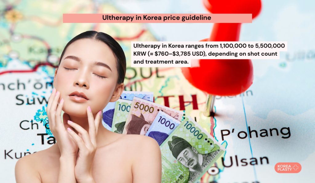 Ultherapy cost in Korea typically ranges from 1,100,000 KRW to 5,500,000 KRW, approximately 760 to 3,785 USD. Full face and neck treatment cost 5,500,000, while full face Ultherapy costs $1,500-$2,200. Prices depend on the number of shots: 100 shots cost 950,000 won, 300 shots cost 1,940,000 won, 600 shots cost 3,590,000 won, and 900 shots cost 5,240,000 won. Forena Clinic provides Ultherapy Prime prices for 100 shots at 490,000 won, 300 shots at 1,390,000 won, and 600 shots at 2,590,000 won. Ultherapy cost in Korea is about 35 % less than in the United States, where the average cost is $4,000.